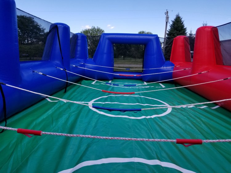 - The equipment includes: Human Foosball, 2(two) 1.5hp blower, 50ft /100ft extension cord, 1 soccer ball, 4 stakes (grass) or sand bags (pavement or indoors)